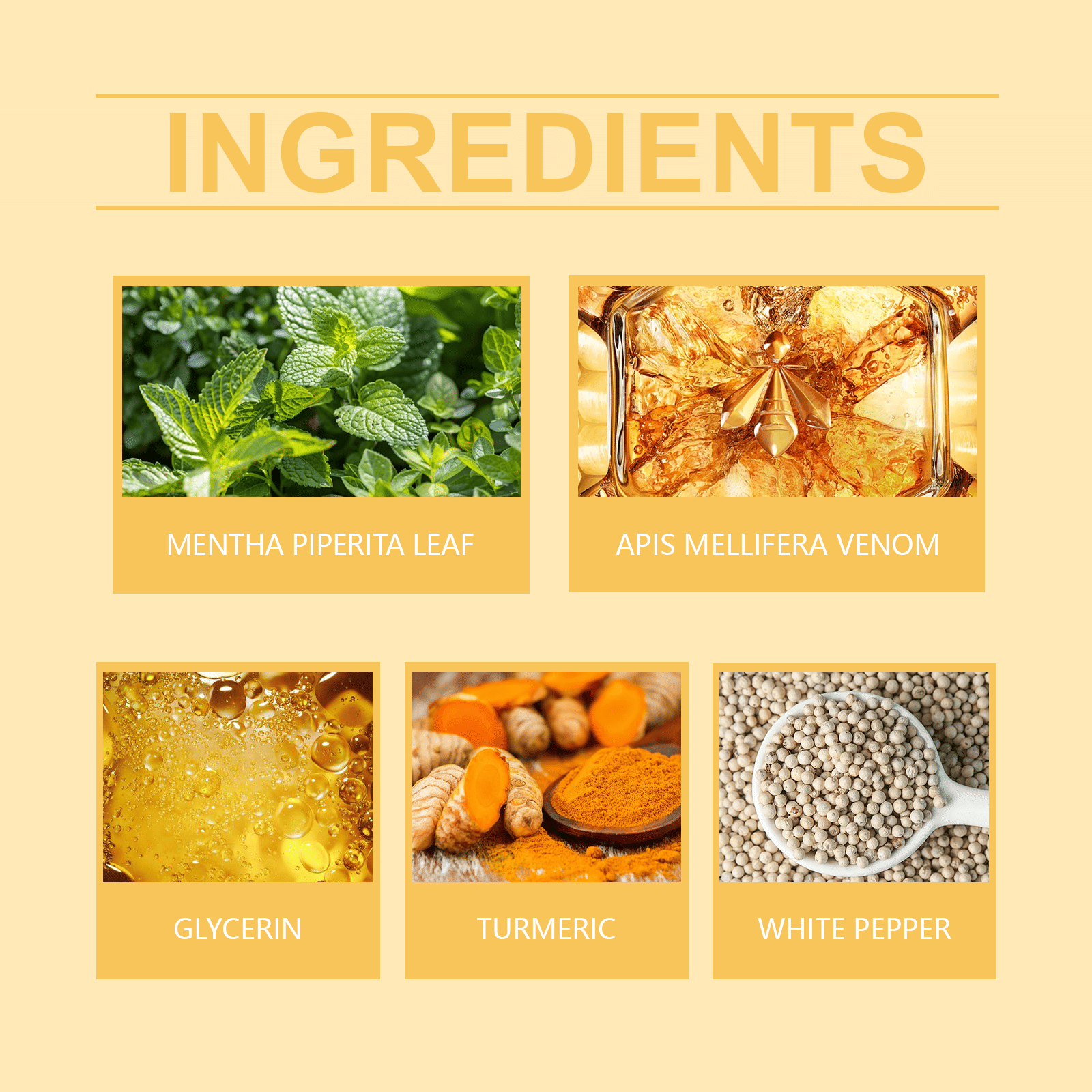 Our bee venom and turmeric Body Care cream contains bee venom, turmeric and white pepper. It can rapidly activate lipid breakdown with remarkable effects. Its usage is very simple: Take an appropriate amount of this product and apply it evenly to the desired area, then gently massage until absorbed. And it adopts a pasting design, which can be applied anytime and anywhere.