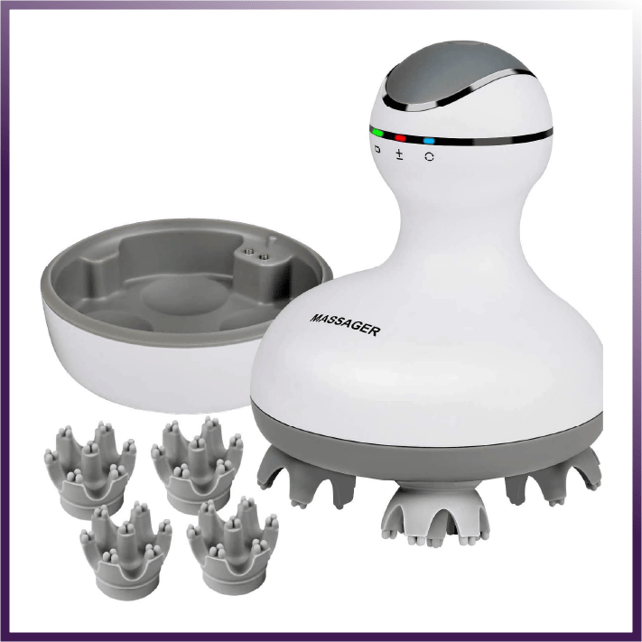 - WATERPROOF & SKIN-FRIENDLY: The electric head massager is made from IPX-7 Waterproof material, allowing you to use it during the shower for a proper scalp massage, relaxing thoroughly with 4-mode tension like a physical therapist. The eco-friendly soft silicone heads prevent hair from being pulled or tangled and do not hurt your skin, making it safe for all skin types. The massage nodes are detachable for easy cleaning.